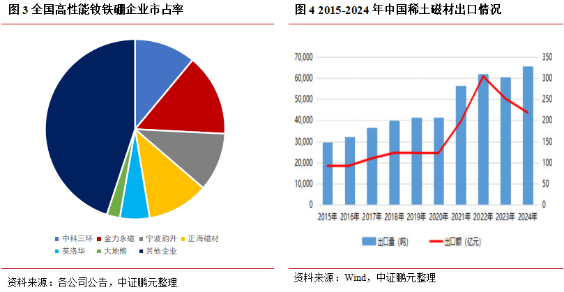 我国稀土永磁材料的产业链从上游资源开采到下游应用制造,逐步形成完整的闭环。目前,全球具备规模化生产能力的稀土永磁企业约50家,其中中国企业超40家,占据全球90%的产能;海外企业约10家,主要分布于日本(日立金属、信越化学)、德国(VAC)及美国(Noveon)等地,但产能规模均较小。例如,美国唯一一家永磁材料烧结钕铁硼生产商诺维恩(Noveon),产能规模仅1000吨。我国稀土永磁材料的产业链从上游资源开采到下游应用制造,逐步形成完整的闭环。上游资源开采:我国是全球最大的稀土资源国,储量占全球33.8%,其中轻稀土储量占全球64%。2025年我国稀土开采配额为30万吨,占全球总量的64%。六大稀土集团(如北方稀土、中国稀土等)主导资源开采,形成集中化格局。随着国家对稀土产业管控加强,通过并购整合与出清非法产能,在资源端将形成北方稀土(掌控全国75%的轻稀土开采配额和67%的冶炼分离指标)和中国稀土集团(垄断中重稀土供应、掌控25%轻稀土开采配额和33%的冶炼分离指标)“南北双寡头”格局,这种高度集中的市场结构赋予龙头企业显著的成本优势和强大的议价能力,同时有效避免低价竞争,我国在全球稀土市场的话语权与影响力稳步提升。中游冶炼分离:我国在稀土冶炼分离技术上具备全球领先优势,技术壁垒高。例如,中国铝业拥有3.37万吨/年的稀土冶炼分离产能,久吾高科则通过膜分离技术实现高效、环保的稀土提纯。下游材料与应用:我国是全球最大的稀土永磁材料市场,市场份额超过70%。金力永磁、中科三环、宁波韵升等企业专注于高性能钕铁硼磁材的研发与生产,广泛应用于新能源汽车、工业伺服电机、机器人等领域。近年来,国内规模较大的稀土永磁材料企业逐步扩张,中小型企业的生存空间不断被压缩,行业整体呈现出高集中度特征,几家国内大型企业占据了主要市场份额。这些企业拥有先进的生产技术与设备,具备较强的研发能力,能够满足大规模生产和多样化需求。金力永磁(2024年产能3.2万吨)、正海磁材(产能3万吨)、中科三环(产能2.5万吨)和宁波韵升(产能2.1万吨)等企业在国内外市场具有较高的知名度和竞争力,产品主要为高性能钕铁硼。