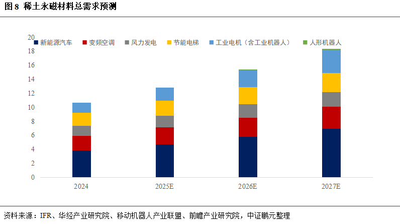 全球能源转型,稀土永磁材料需求迅速增长。在全球加速迈向清洁能源和可持续发展的浪潮中,新能源汽车、风电等下游行业对稀土永磁材料的需求持续旺盛。2025年全球钕铁硼永磁体需求将突破33万吨,对应的氧化镨钕消费量高达11万吨,供需缺口逐渐显现。从国内来看,根据安泰科数据,2024年我国钕铁硼永磁体消费总量约为19.5万吨,占全球永磁体市场的75%,其中,新能源汽车、工业电机、家电、工业机器人和电动自行车等消费量分别为5.5万吨、4.8万吨、4.7万吨、1.7万吨和1.6万吨,其他1.2万吨。总体来看,广泛应用于新能源和电器等领域的永磁材料是稀土最主要的下游需求方向,近几年快速发展的中国新能源汽车和风电行业则贡献永磁材料需求端主要增量,推升钕铁硼等核心品种价格上涨。另外,海外厂商因考虑到库存安全,补库需求将持续,亦在拉动稀土磁材需求。