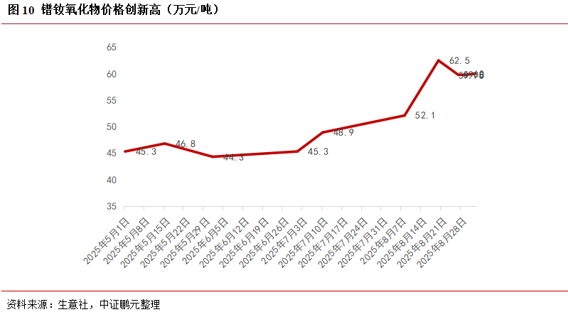 美国以“最低价”提供托底支持,对全球镨钕价格形成支撑效应。自中国颁布稀土管制新规定以来,美国、澳大利亚以及多家西方企业加速推进对关键矿产的投资布局,企图达成稀土供应链的“去中国化”目标。7月10日,美国国防部投入4亿美元收购MP Materials优先股,获取15%股权,成为该公司最大股东,并锁定为期十年的稀土永磁体采购协议,将镨钕氧化物的最低价格设定为110美元/公斤(折合国内含税价约89万元/吨),此价格远高于同期国内镨钕氧化物45.3万元/吨的报价。这一“官方背书”举措直接抬高了全球镨钕的“价格锚点”,国内稀土分离企业纷纷对报价作出调整。8月20日,内盘氧化镨钕报价上调至62.5万元/吨,相较于7月初上涨了17.2万元/吨。