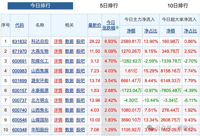 具体来看,山西涨幅靠前的前十家上市公司中,多为煤炭及相关(煤焦化)行业,如阳煤化工(维权)、山西焦煤、潞安环能、永泰能源、山西焦化、山煤国际、华阳股份,科达自控第一大主业则为智慧矿山建设。