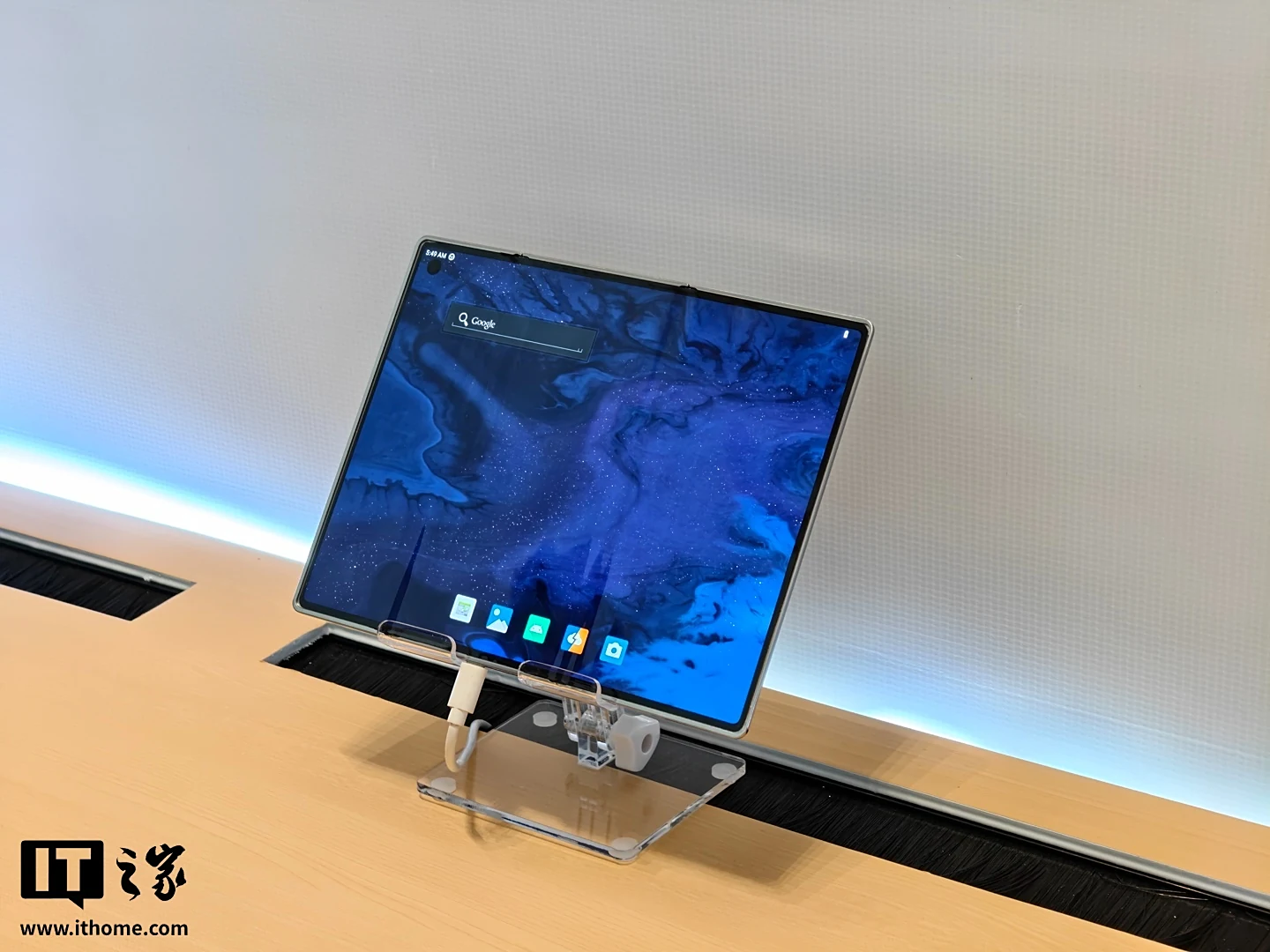 在发布会展示区,天马展出了三折叠手机屏幕方案,号称是“全球首款 G 形三折叠”,其方案与华为 Mate XT 的 Z 字形三折叠不同,采用了内向折叠的方案,整体形态较为创新。