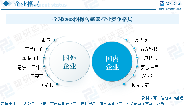 从竞争格局来看,全球CMOS图像传感器市场长期由索尼、三星电子、海力士等国外龙头企业主导,市场集中度较高。其中,索尼是全球CMOS图像传感器市场的领导者,拥有先进的技术和丰富的产品线。索尼的图像传感器在智能手机、数码相机等领域占据重要地位。三星是CMOS图像传感器市场的第二大企业,其产品主要应用于自己的手机端,并凭借高性价比在市场上占据一席之地。国内CMOS图像传感器企业主要包括瑞芯微、晶方科技、思特威、豪威集团、格科微等企业。随着国内产业链协同效应增强和研发投入持续加大,中国CMOS图像传感器企业正迎来重要发展机遇期。