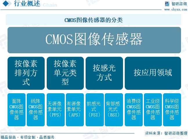 CMOS图像传感器(CIS)是将光子转换为电子进行数字处理,把图像信号转换为数字信号的芯片,主要用于在数码相机、数码闭路电视摄像机和数码摄像机中的创建图像,是数码摄像头的关键部件。由于摄像头的功能包括拍照、摄像、图像识别、身份验证等,数码产品对CMOS图像传感器性能的要求也越来越高。CMOS图像传感器通常由像敏单元阵列、行驱动器、列驱动器、时序控制逻辑、AD转换器、数据总线输出接口、控制接口等几部分组成,这几部分通常都被集成在同一块硅片上。其工作过程一般可分为复位、光电转换、积分、读出几部分。CMOS图像传感器按像素排列方式可分为面阵CMOS图像传感器、线阵CMOS图像传感器;按像素单元类型可分为无源像素单元(PPS)、有源像素单元(APS);按感光方式可分为前感光式(FSI)、背部感光式(BSI);按应用领域可分为消费级CMOS图像传感器、工业级CMOS图像传感器和科学级CMOS图像传感器。