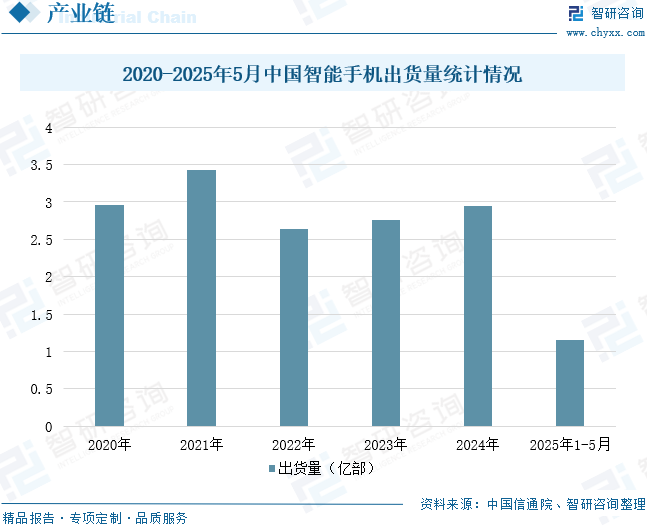 智能手机是CMOS图像传感器的最大应用领域,占比超过60%,主要用于制作摄像头。智能手机摄像头一般由保护膜、镜头组、对焦马达、红外滤光片、CMOS图像传感器、PCB板等物理部件组成,其中,CMOS图像传感器是摄像头模组的核心器件。以智能手机出货量为例,近几年,中国智能手机出货量持续走低,主要是智能手机渗透率触顶与技术升级缓慢导致消费者换机周期延长。2024年,得益于国内经济形势的稳定、消费者对新技术应用的持续关注,以及国内手机产业链企业的创新能力增强,全年智能手机市场出货量达到2.86亿台,同比增长5.6%,结束了连续两年的下滑趋势,呈现出强劲的复苏态势。2025年1-5月,中国智能手机出货量为1.15亿部,同比增长11.1%,占同期手机出货量的94.4%。随着5G换机潮的深入和影像技术的持续突破,智能手机市场有望保持稳健增长,这将进一步带动CMOS图像传感器等核心元器件的技术创新和产业升级。