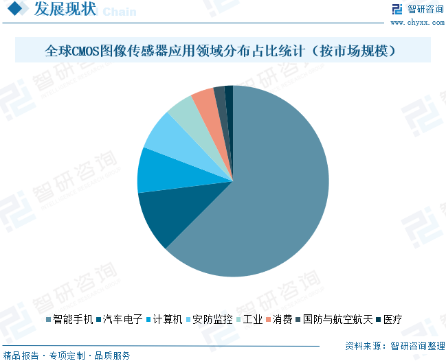 从下游应用情况来看,CMOS图像传感器应用广泛,全球CMOS图像传感器主要细分领域包括智能手机、汽车电子、计算机、安防监控、工业(含机器视觉)、消费、国防与航空航天(含科学仪器)和医疗等领域,多个细分领域蓬勃发展。其中智能手机占比最大,达62.48%。