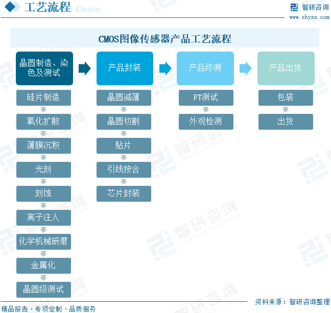 从产品工艺流程来看,CMOS图像传感器主要包括晶圆制造、滤色和微透镜加工、晶圆探针测试、封装等环节,其中,晶圆制造环节主要涉及晶圆氧化、光刻、离子注射退火、扩散、研磨、测试等工艺,封装主要包含晶圆划片、贴片、引线键合、芯片封装等主要工艺,从封装工序来看,主要分为前道封装和后道封装两大工序,前道封装主要工序包括贴膜、研磨、撕片、划片等工艺,后道封装主要包括贴片、点胶、键合、组装等工艺。