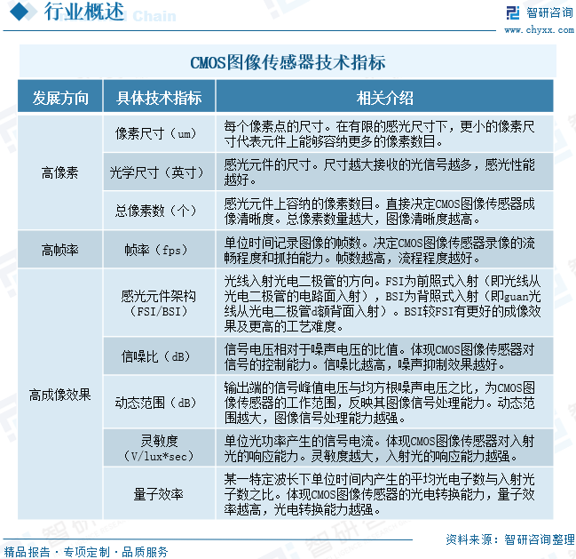 当前CMOS图像传感器的的三大升级方向为:高像素、高帧率与高成像效果。评价CMOS图像传感器的成像质量一般考虑以下核心技术指标:光学尺寸、像素大小、像素数、帧率、感光元件架构、信噪比、动态范围、灵敏度、量子效率等。为了达到更为优异的技术指标,产业链环节CMOS图像传感器的设计、制造与封测等多方面需要达到更高的水准。