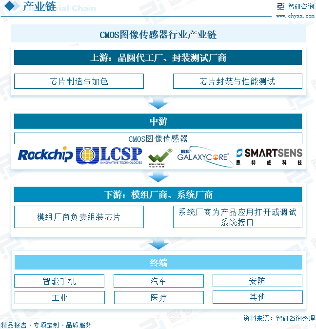 从产业链来看,CMOS图像传感器产业链上游主要包括晶圆代工厂、封测厂,中游主要为CMOS图像传感器设计企业,下游包括各种模组厂商和系统厂商,终端为应用领域,包括智能手机、汽车、安防、工业、医疗等领域。下游客户对芯片的稳定性、可靠性要求非常严格。新研发的芯片需要经过漫长的客户验证才能正式投产使用。而下游厂商一旦建立合作关系,通常不会轻易更换供货商,因此新公司难以争取到稳定的客户资源。