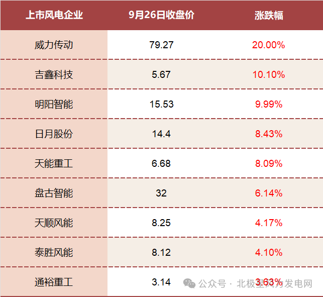 北极星风力发电网获悉:截至9月26日收盘,以风电设备板块为代表的上市企业股价出现大幅上涨,明阳智能、威力传动、吉鑫科技三家风电企业股票涨停,日月股份、天能重工、盘古智能、天顺风能等风电企业跟涨。