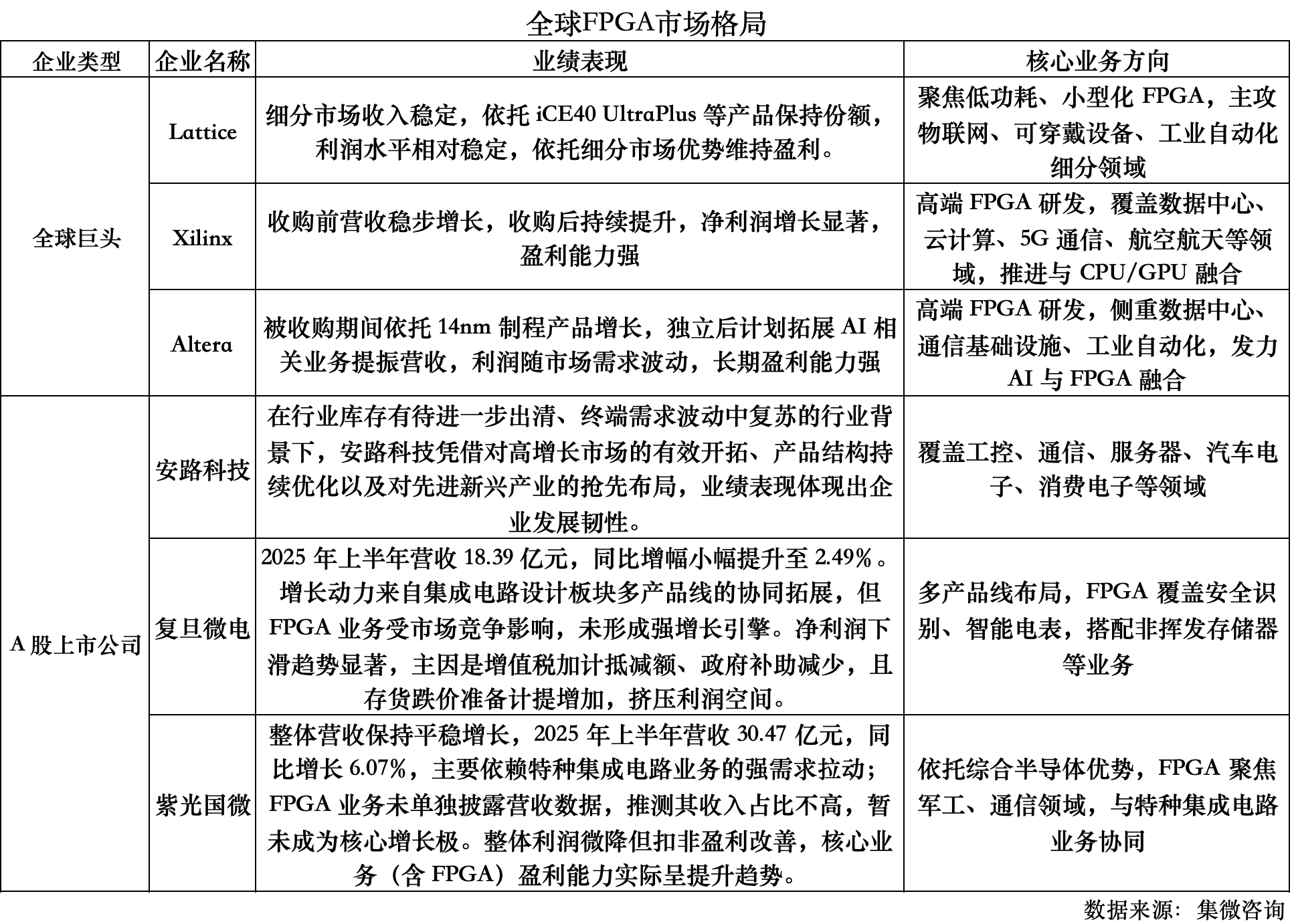 当前,市场呈现 “欧美巨头主导高端、中国企业追赶中低端” 的竞争态势:赛灵思、Altera 凭借数十年技术积累与高研发投入,在数据中心、航空航天等高端领域构筑深厚壁垒,Lattice 则以低功耗细分市场的差异化优势站稳脚跟;国内企业虽面临营收波动、利润承压等挑战,但安路科技的高强度研发、复旦微电的多产品协同、紫光国微的特定领域深耕,已展现出国产替代的潜力与韧性。