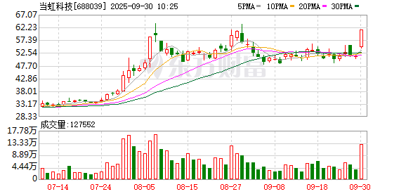 9月30日盘中科创板股当虹科技涨停,截至09:39,股价报61.32元,成交2.99亿元,换手率4.61%,振幅13.97%。