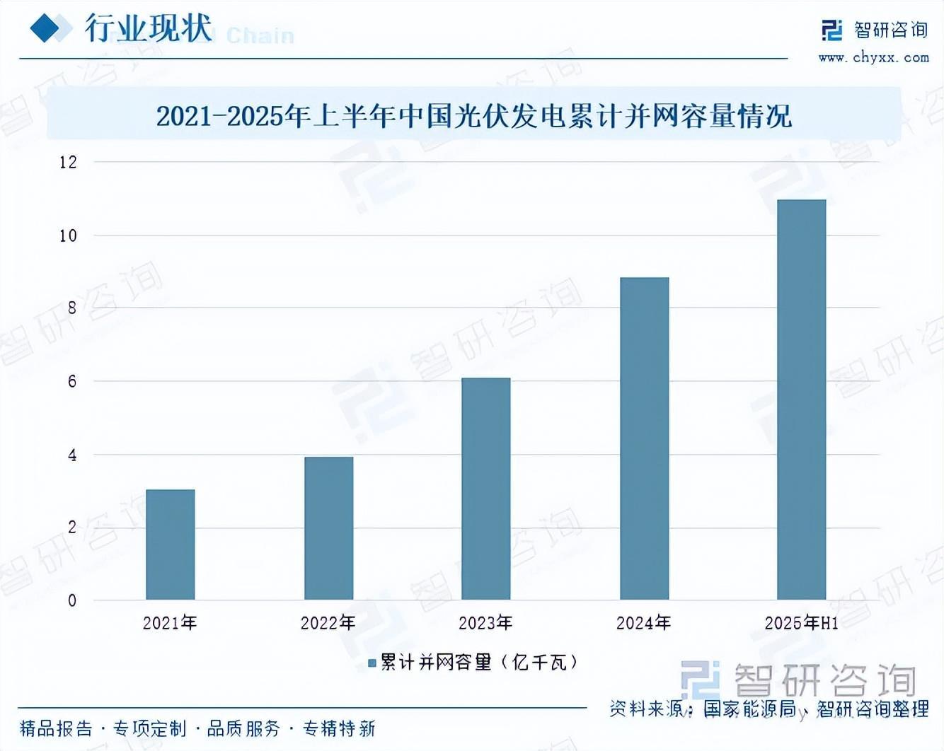 光伏发电作为清洁能源的重要组成部分,正以迅猛的态势推动着中国能源结构的转型。截至2025年6月底,中国光伏发电累计并网容量达10.99亿千瓦,同比增长54.08%。光伏发电装机容量的大幅增长直接推动了光伏跟踪支架的需求。光伏跟踪支架通过自动调整光伏组件的角度,能够最大化地提高发电效率,尤其在大型地面电站中,其优势更为明显。