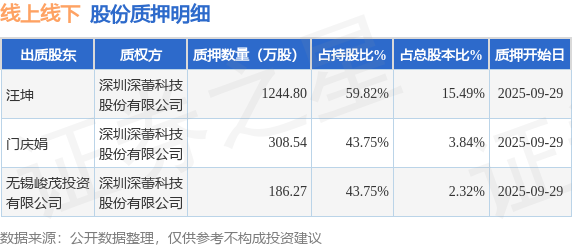 证券之星消息,线上线下(300959)10月9日公开信息显示,股东汪坤、门庆娟、无锡峻茂投资有限公司向深圳深蕾科技股份有限公司合计质押1739.61万股,占总股本21.65%。质押详情见下表: