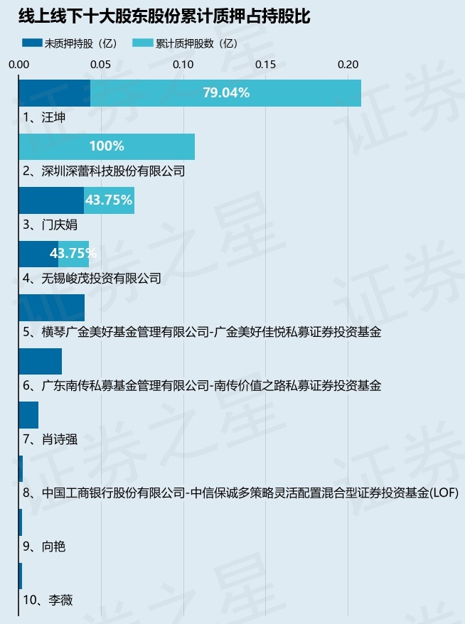 截止本公告日,股东汪坤已累计质押股份1644.8万股,占其持股总数的79.04%,股东深圳深蕾科技股份有限公司已累计质押股份1070.62万股,占其持股总数的100.0%,股东门庆娟已累计质押股份308.54万股,占其持股总数的43.75%,股东无锡峻茂投资有限公司已累计质押股份186.27万股,占其持股总数的43.75%。本次质押后线上线下十大股东的累计质押股份占持股比例(占持股比例的计算以公司最新一期财务报表公布的十大股东的持股总数为基准)见下图: