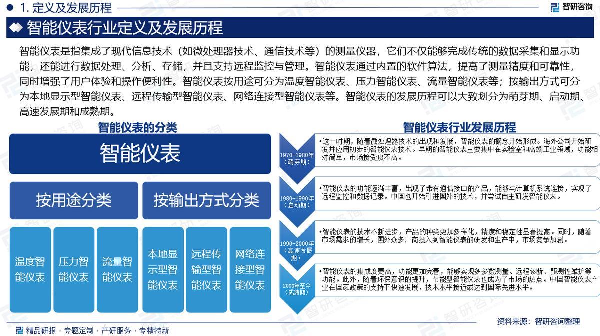 行业相关政策:智能仪表作为现代工业自动化与信息化深度融合的产物,正在全球范围内掀起一场测量技术的革命。从传统机械式仪表到数字化、网络化、智能化的跨越,这一技术演进不仅重构了工业生产流程,更深刻影响着能源管理、城市治理和民生服务等众多领域。中国政府高度重视智能仪表产业的发展,通过出台一系列政策来支持智能仪表行业的研发、生产和应用。例如《制造业中试创新发展实施意见》《2024年度实施企业标准“领跑者”重点领域》《关于做好2025年工业和信息化质量工作的通知》《关于制造业计量创新发展的意见》等,政策的推动和工业自动化水平的提高,为智能仪表市场的发展提供了强大的动力。