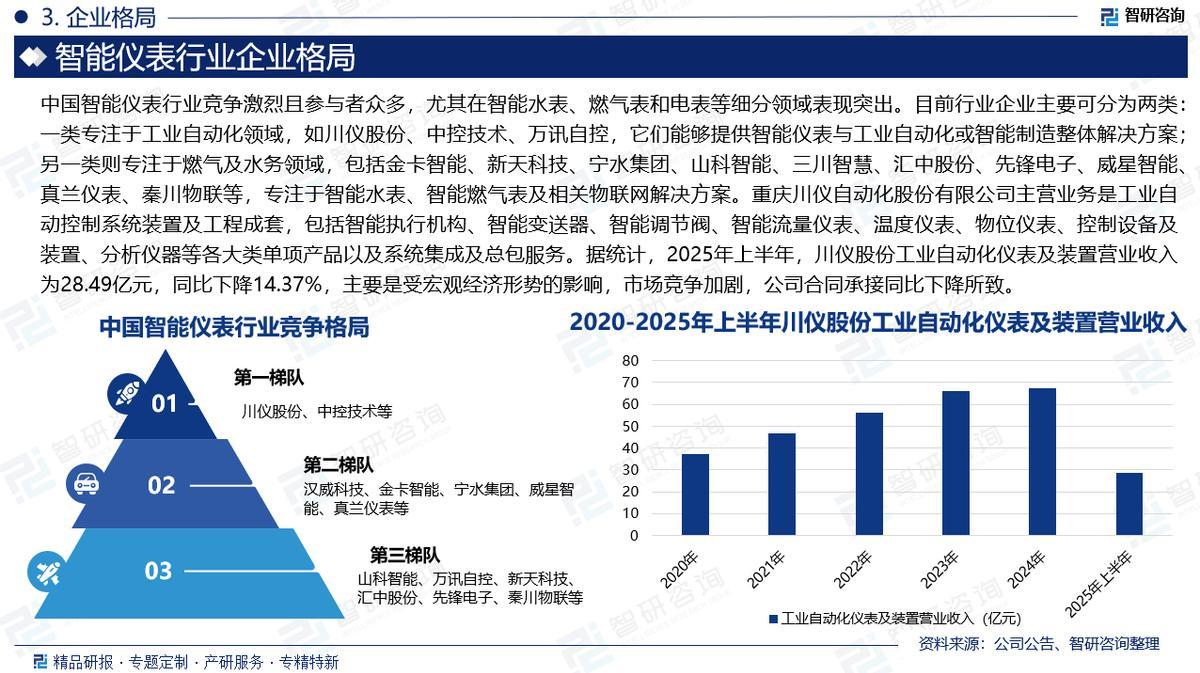 智能仪表是指集成了现代信息技术(如微处理器技术、通信技术等)的测量仪器,它们不仅能够完成传统的数据采集和显示功能,还能进行数据处理、分析、存储,并且支持远程监控与管理。智能仪表通过内置的软件算法,提高了测量精度和可靠性,同时增强了用户体验和操作便利性。智能仪表按用途可分为温度智能仪表、压力智能仪表、流量智能仪表等;按输出方式可分为本地显示型智能仪表、远程传输型智能仪表、网络连接型智能仪表等。随着我国经济快速发展和工业化进程的不断深化,国家基础设施建设和工业自动化水平持续提升,为智能仪表市场带来强劲动力。与此同时,我国城镇化进程的加快和智慧城市建设的推进,使得智能仪表在城市管理、能源监测、水资源管理等领域的应用越来越广泛,市场需求持续增长。数据统计,2018-2024年中国智能仪表行业市场规模从4924亿元增长至7084亿元,年复合增长率为6.25%。预计2025年中国智能仪表行业市场规模将达到7573亿元。中国智能仪表行业竞争激烈且参与者众多,尤其在智能水表、燃气表和电表等细分领域表现突出。目前行业企业主要可分为两类:一类专注于工业自动化领域,如川仪股份、中控技术、万讯自控,它们能够提供智能仪表与工业自动化或智能制造整体解决方案;另一类则专注于燃气及水务领域,包括金卡智能、新天科技、宁水集团、山科智能、三川智慧、汇中股份、先锋电子、威星智能、真兰仪表、秦川物联等,专注于智能水表、智能燃气表及相关物联网解决方案。根据企业营业收入来看,行业呈现出明显的梯队分化,第一梯队主要包括川仪股份、中控技术等;第二梯队主要包括汉威科技、金卡智能、宁水集团、威星智能、真兰仪表等企业,第三梯队则涵盖山科智能、万讯自控、新天科技、汇中股份、先锋电子、秦川物联等企业。