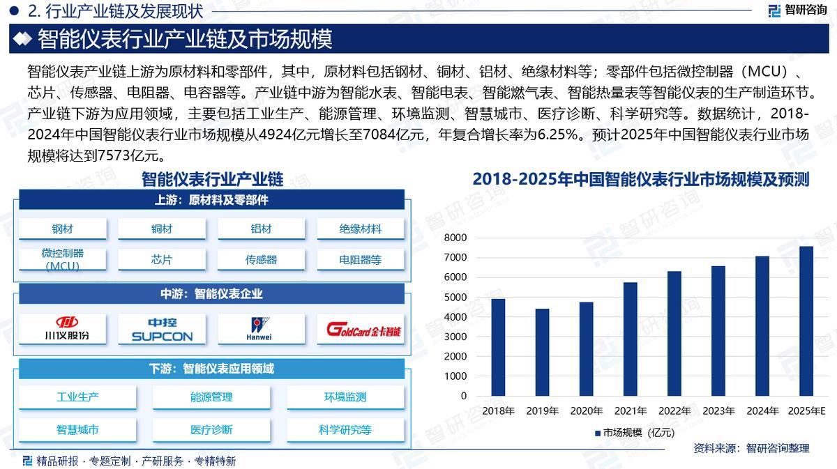 智能仪表市场规模:随着我国经济快速发展和工业化进程的不断深化,国家基础设施建设和工业自动化水平持续提升,为智能仪表市场带来强劲动力。与此同时,我国城镇化进程的加快和智慧城市建设的推进,使得智能仪表在城市管理、能源监测、水资源管理等领域的应用越来越广泛,市场需求持续增长。数据统计,2018-2024年中国智能仪表行业市场规模从4924亿元增长至7084亿元,年复合增长率为6.25%。预计2025年中国智能仪表行业市场规模将达到7573亿元。
