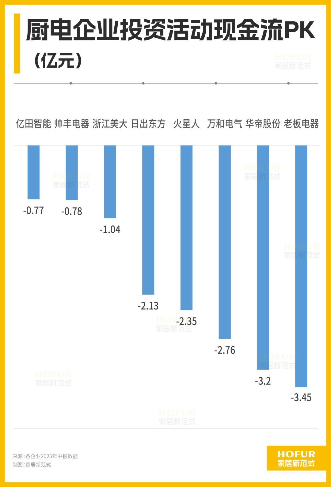 从投资活动现金流来看,几乎所有企业都开始按下“暂停键”,战略收紧,核心动作变成了回笼资金,巩固核心。就连老板电器、华帝股份这样的巨头都在主动大幅收缩投资阵线,走 “高筑墙、广积粮”的谨慎路线。