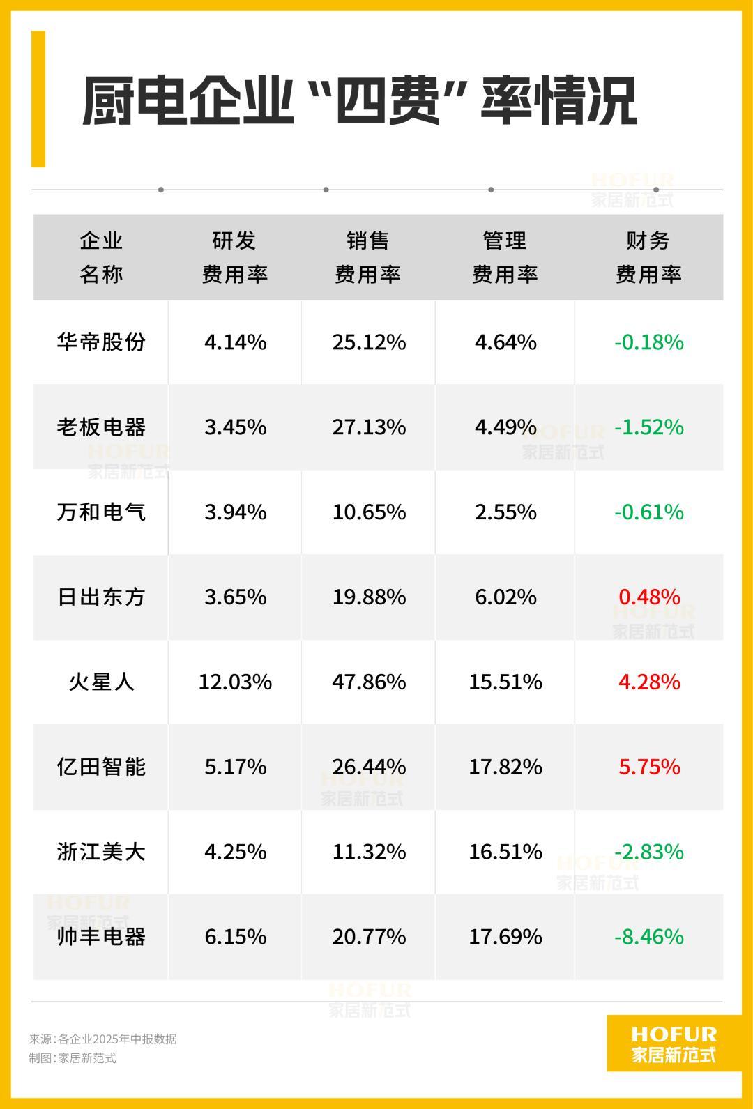 引人关注的财务费用方面,帅丰、浙江美大、老板、华帝、万和均为负,可见厨电行业的资金管理或汇率操作普遍较好;财务费用率相对较高的火星人、亿田智能则因为是存款、债券利息的变化所致。