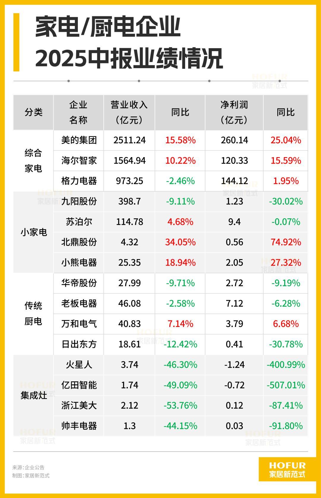 原以为“国补”东风下,家电行业火热一片,但结合2025年业绩中报及近期表现发现,分化趋势正愈发剧烈。一边是综合家电与小家电企业的红红火火,另一边传统厨电与集成灶企业却跌跌不休。美的、海尔等综合巨头凭借“国补”政策、海外市场与智能新品三大引擎逆势增长,而集成灶“四小龙”则集体深陷营收净利双降的泥潭。