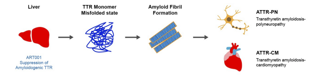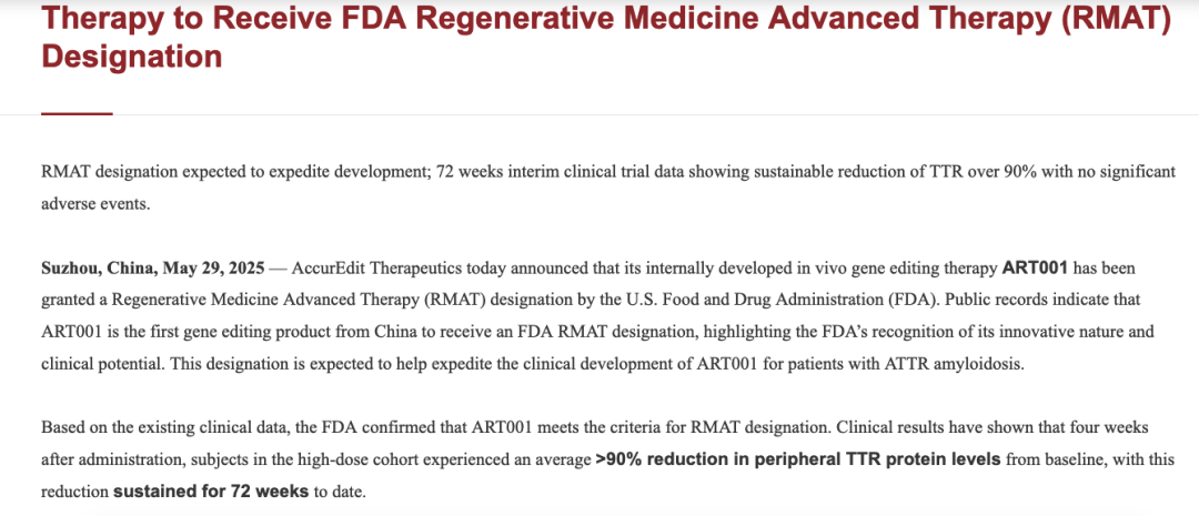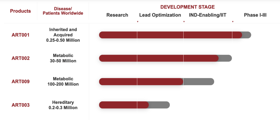 针对转甲状腺素蛋白淀粉样变性(ATTR)的产品ART001(LNP为载体的体内基因编辑候选创新药);初步临床数据显示:ART001给药4周后,高剂量组受试者的外周TTR蛋白较基线平均下降达90%以上,且已维持稳定72周。