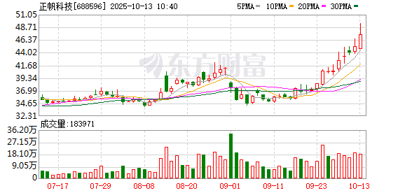 正帆科技股价创出历史新高,截至9:42,该股上涨7.08%,股价报48.39元,成交量996.82万股,成交金额4.79亿元,换手率3.40%,该股最新A股总市值达141.75亿元,该股A股流通市值141.75亿元。