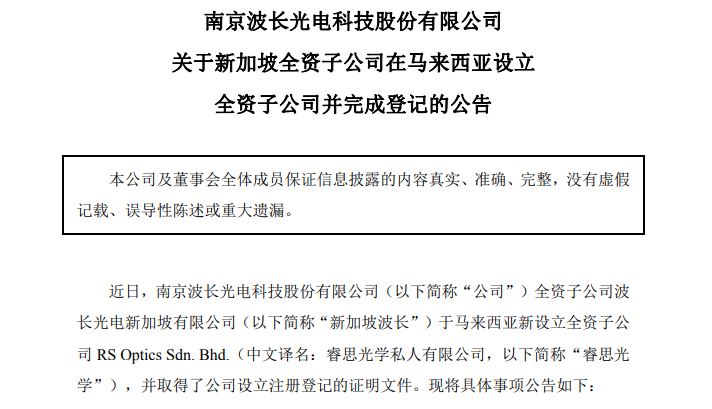 近日,波长光电全资子公司新加坡波长于马来西亚设立全资子公司 RS Optics Sdn. Bhd.(中文译名:睿思光学私人有限公司),注册资本 1 马来西亚林吉特。