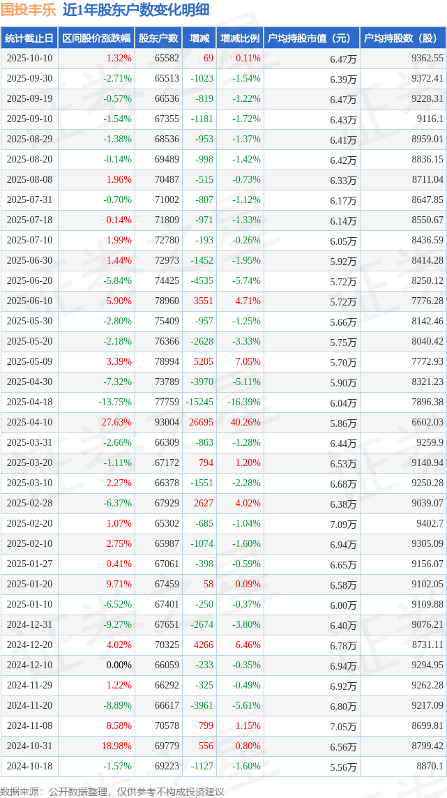 从股价来看,2025年9月30日至2025年10月10日,国投丰乐区间涨幅为1.32%,在此期间股东户数增加69.0户,增幅为0.11%。
