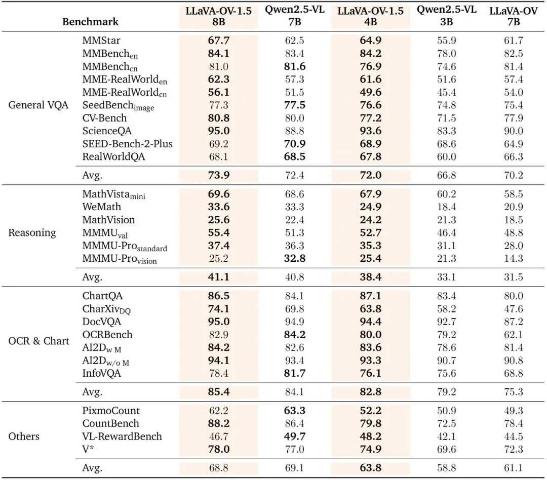 实验结果显示,LLaVA-OneVision 在多项公开多模态基准上较 Qwen2.5-VL 展现出竞争性乃至更优性能(详见技术报告)。