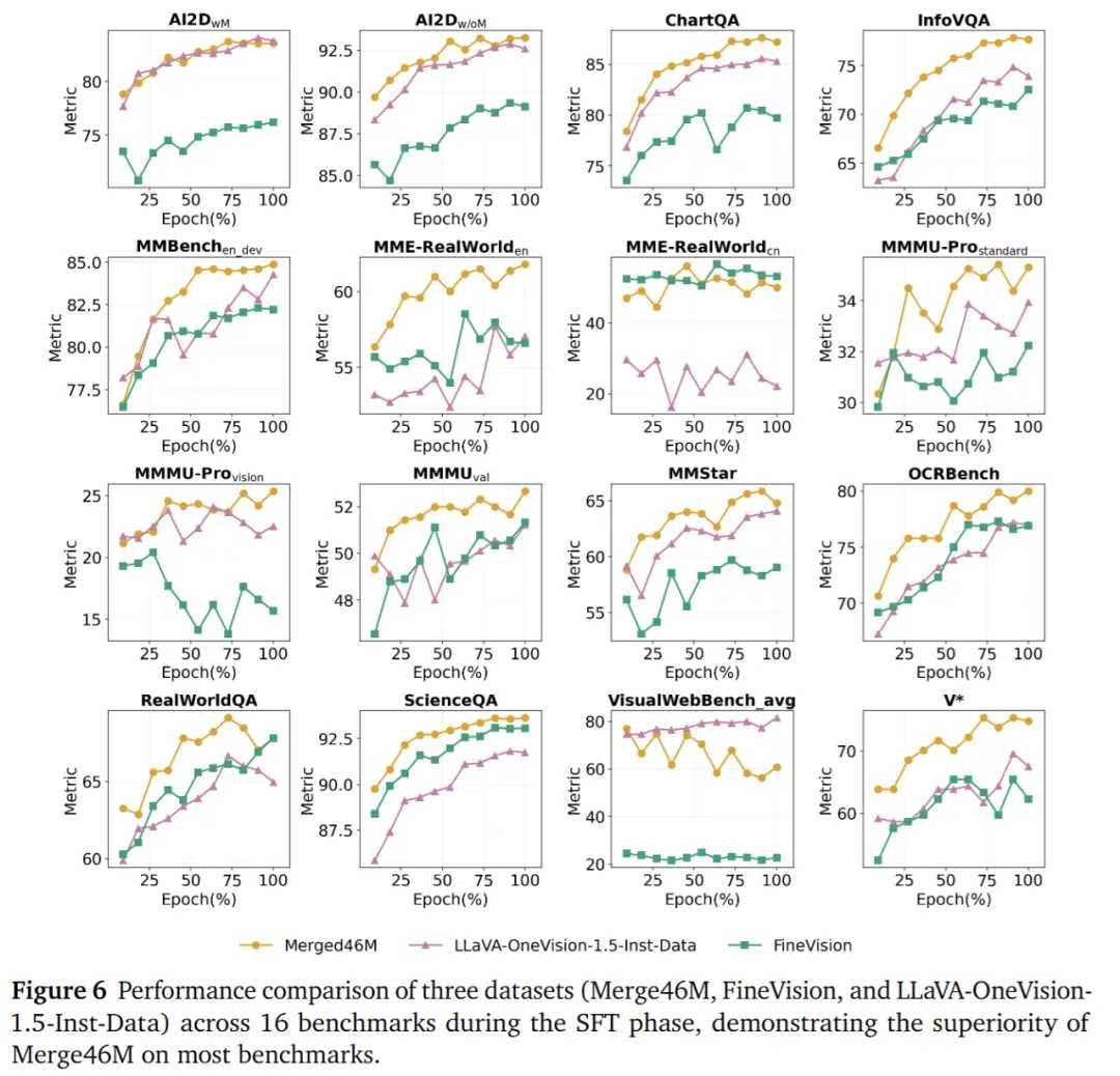 指令数据 22M 覆盖八大类别:Caption、Chart & Table、Code & Math、Domain-specific、General VQA、Grounding & Counting、OCR、Science。通过多源聚合、格式统一、指令重写、双语互转、模板去同质化与安全筛除,保持类别与难度分布均衡。并且我们的指令数据叠加 FineVision 数据集之后,结果会继续增加。
