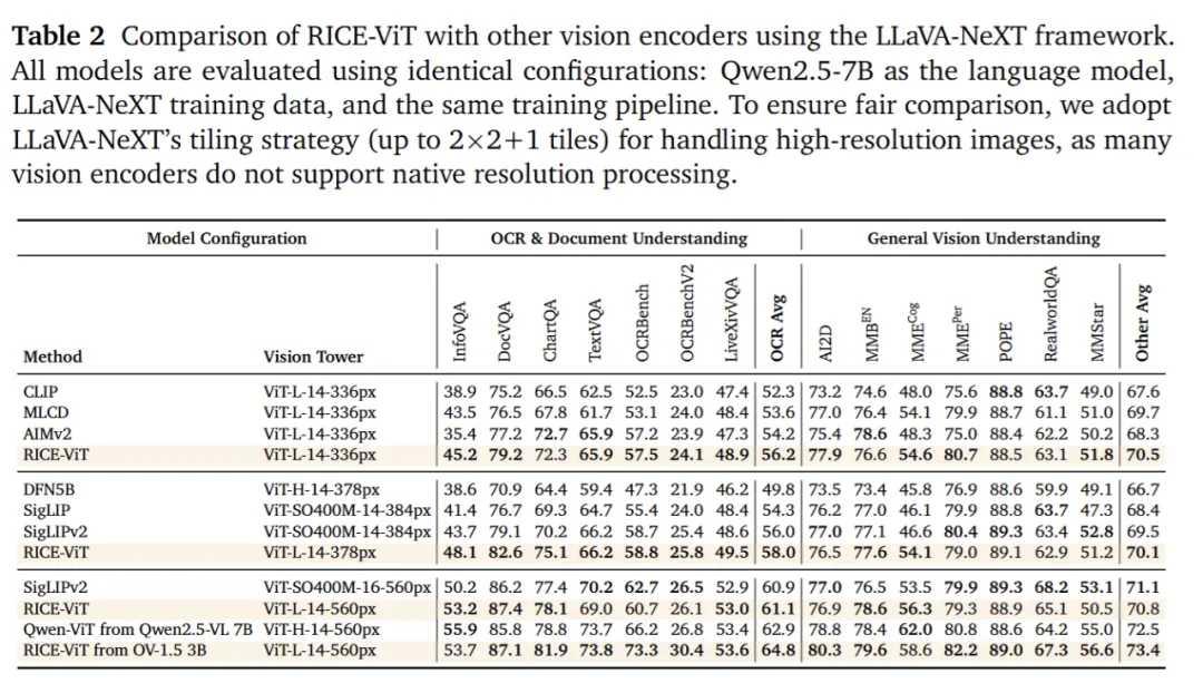 相较仅做全局对齐的 CLIP / SigLIP 类对比模型,RICE-ViT 针对「实例只用单一全局向量」这一结构性瓶颈,引入统一的 Region Cluster Discrimination 机制:在 4.5 亿图像与 24 亿候选区域上训练,利用区域聚类判别 + 区域感知注意力显式建模局部实体 / 文本块与上下文关系,并结合 2D 旋转位置编码(2D RoPE)实现多分辨率原生支持。