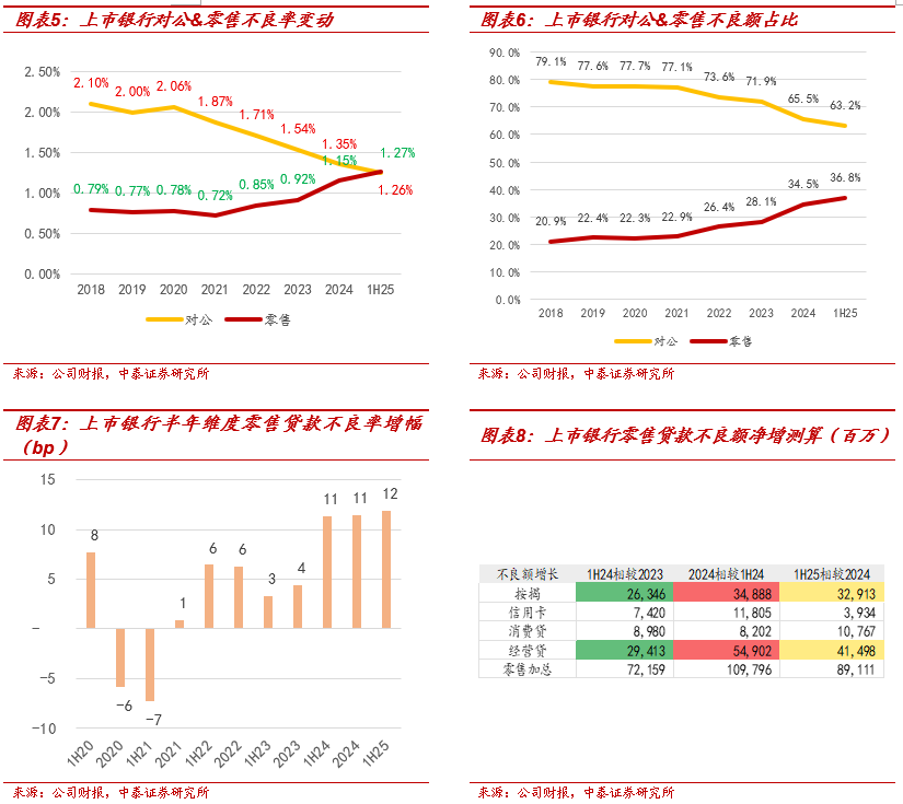 对于零售资产中上升幅度最快的个人经营贷款,我们 6 月判断 24 年高风险经营贷暴露较多,后续暴露幅度有望趋缓,8 月 1H25 数据出炉后有所验证。(1)根据我们在 6 月 22 日《专题 | 银行股:从“顺周期”到“弱周期”——银行周期属性再讨论》中的测算,测算 24 年个人经营贷已暴露不良占偏高风险资产的 1/5,后续暴露幅度有望趋缓。(2)8 月 1H25 数据出炉后,经营贷不良率、不良额升幅均有收窄:测算 1H25经营贷不良率相较 2024 提升 19bp(2024 相较 1H24 提升 22bp),测算 1H25 经营贷不良额相较 2024 净增 415 亿(2024 相较 1H24 净增 549亿)。