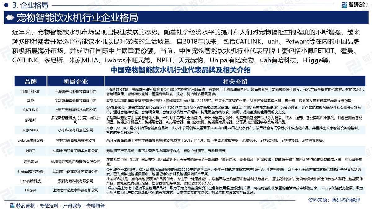 企业格局:近年来,宠物智能饮水机市场呈现出快速发展的态势。随着社会经济水平的提升和人们对宠物福祉重视程度的不断增强,越来越多的消费者开始选择智能饮水机以提升宠物的生活质量。自2018年以来,包括CATLINK、uah、Petwant等在内的中国品牌积极拓展海外市场,并成功在国际中占据重要份额。当前,中国宠物智能饮水机行业代表品牌主要包括小佩PETKIT、霍曼、CATLINK、多尼斯、米家MIJIA、Lwbros来旺兄弟、NPET、天元宠物、Unipal有陪宠物、uah有哈科技、Hiigge等。