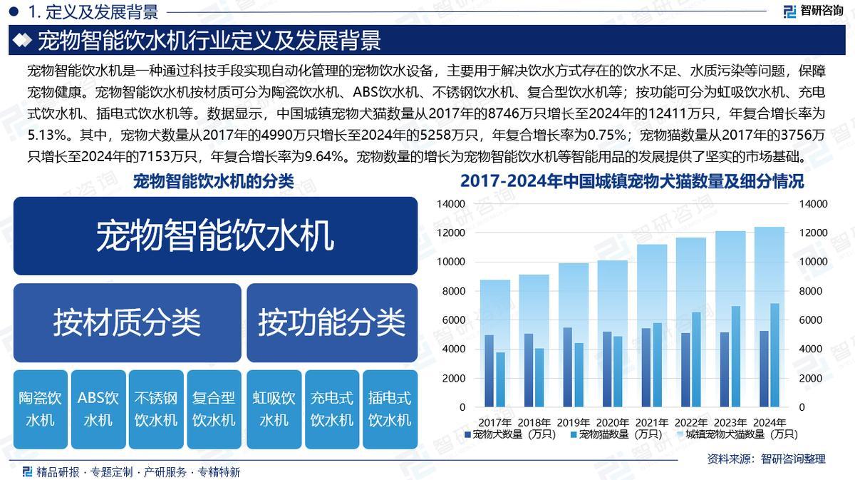 发展背景:随着城市化进程的加快,人们对生活品质的追求不断提升,越来越多的家庭选择饲养宠物来增添生活乐趣。宠物猫因其独立、干净、易于饲养的特性,受到了越来越多年轻人的喜爱,尤其是在大城市中,宠物猫的数量增长尤为显著。与此同时,宠物狗虽然数量增长相对缓慢,但依然是宠物市场的重要组成部分,特别是在陪伴、守护等方面,宠物狗有着不可替代的作用。数据显示,中国城镇宠物犬猫数量从2017年的8746万只增长至2024年的12411万只,年复合增长率为5.13%。其中,宠物犬数量从2017年的4990万只增长至2024年的5258万只,年复合增长率为0.75%;宠物猫数量从2017年的3756万只增长至2024年的7153万只,年复合增长率为9.64%。宠物数量的增长为宠物智能饮水机等智能用品的发展提供了坚实的市场基础。