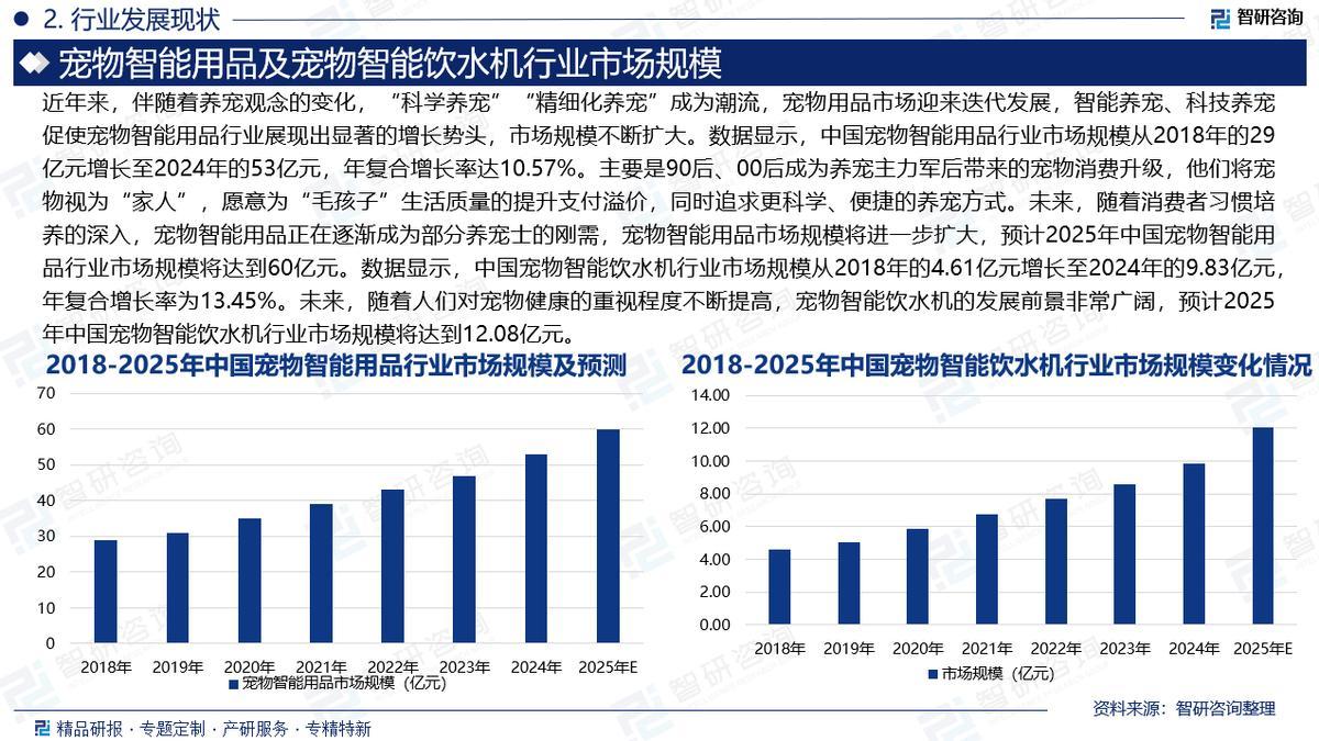宠物智能用品市场规模:近年来,伴随着养宠观念的变化,“科学养宠”“精细化养宠”成为潮流,宠物用品市场迎来迭代发展,智能养宠、科技养宠促使宠物智能用品行业展现出显著的增长势头,市场规模不断扩大。数据显示,中国宠物智能用品行业市场规模从2018年的29亿元增长至2024年的53亿元,年复合增长率达10.57%。主要是90后、00后成为养宠主力军后带来的宠物消费升级,他们将宠物视为“家人”,愿意为“毛孩子”生活质量的提升支付溢价,同时追求更科学、便捷的养宠方式。未来,随着消费者习惯培养的深入,宠物智能用品正在逐渐成为部分养宠士的刚需,宠物智能用品市场规模将进一步扩大,预计2025年中国宠物智能用品行业市场规模将达到60亿元。