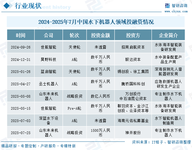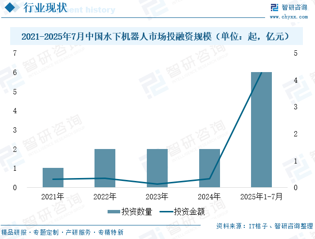 当前,中国自主式水下机器人行业尚处于萌芽探索阶段。数据显示:2021至2024年间资本市场对水下机器人领域的布局较为审慎,四年间行业累计仅完成7起融资事件,总额不过1.05亿元,发展步伐相对稳健而克制。然而,随着2025年海洋强国战略的加速推进及深海技术商业化进程的显著提速,行业骤然迎来爆发式增长契机。仅2025年前7个月便已完成6起融资,总额高达4.25亿元,这一数字不仅超越前四年总和的4倍,显示出资本对深海技术商业化前景的强烈信心,行业正从技术积累期迈向高速扩张期。