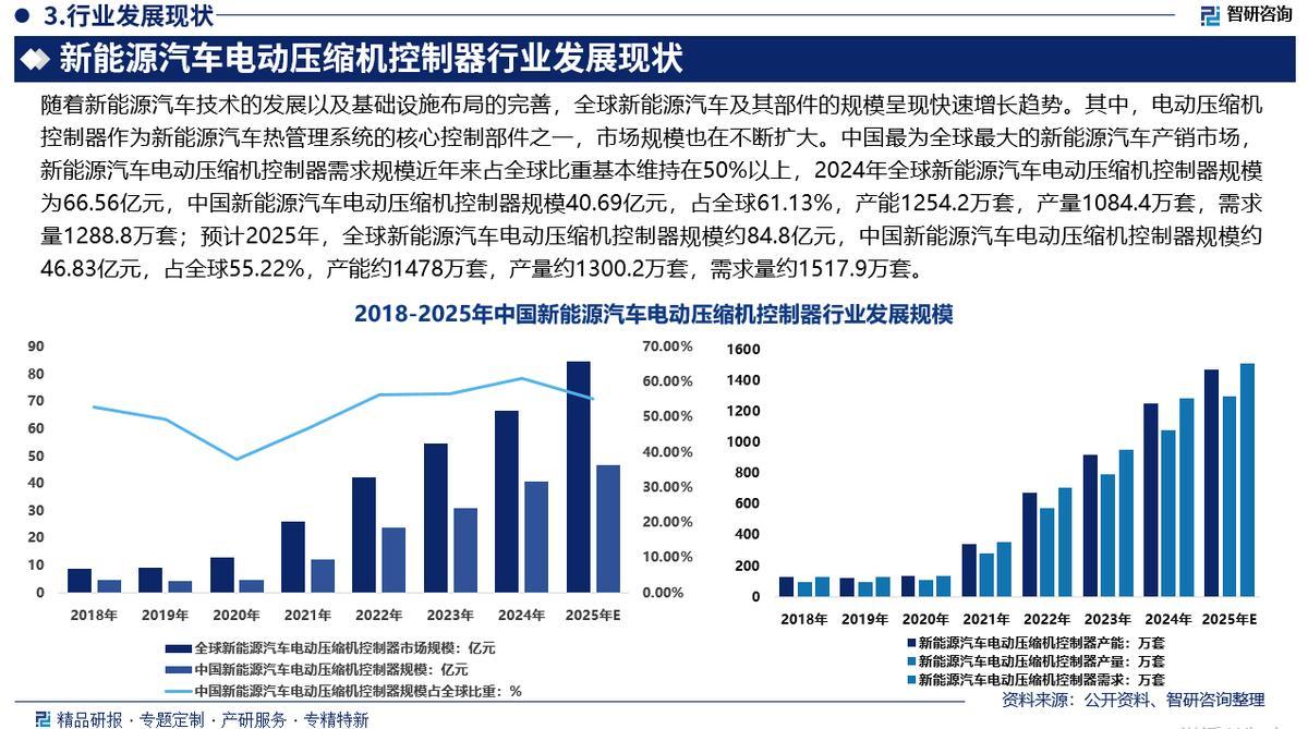 新能源汽车电动压缩机控制器是一种通过接收整车控制器指令,控制电动压缩机电机的启动、停止、转速等参数,以实现对新能源汽车车厢内温度调节和电池热管理的关键零部件。随着新能源汽车技术的发展以及基础设施布局的完善,全球新能源汽车及其部件的规模呈现快速增长趋势。其中,电动压缩机控制器作为新能源汽车热管理系统的核心控制部件之一,市场规模也在不断扩大。中国最为全球最大的新能源汽车产销市场,新能源汽车电动压缩机控制器需求规模近年来占全球比重基本维持在50%以上,2024年全球新能源汽车电动压缩机控制器规模为66.56亿元,中国新能源汽车电动压缩机控制器规模40.69亿元,占全球61.13%,产能1254.2万套,产量1084.4万套,需求量1288.8万套;预计2025年,全球新能源汽车电动压缩机控制器规模约84.8亿元,中国新能源汽车电动压缩机控制器规模约46.83亿元,占全球55.22%,产能约1478万套,产量约1300.2万套,需求量约1517.9万套。