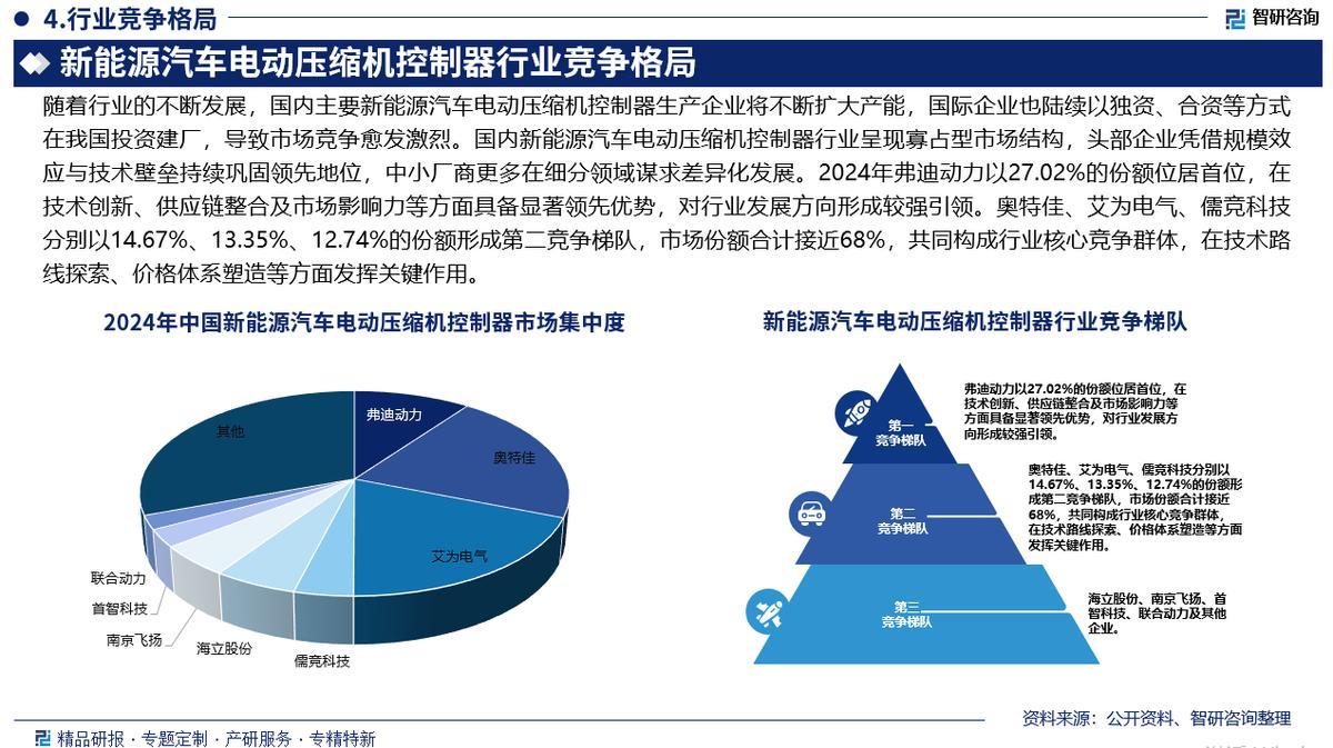 竞争情况:国内主要新能源汽车电动压缩机控制器市场竞争愈发激烈。国内新能源汽车电动压缩机控制器行业呈现寡占型市场结构,头部企业凭借规模效应与技术壁垒持续巩固领先地位,中小厂商更多在细分领域谋求差异化发展。2024年弗迪动力以27.02%的份额位居首位,奥特佳、艾为电气、儒竞科技分别以14.67%、13.35%、12.74%的份额形成第二竞争梯队,市场份额合计接近68%。