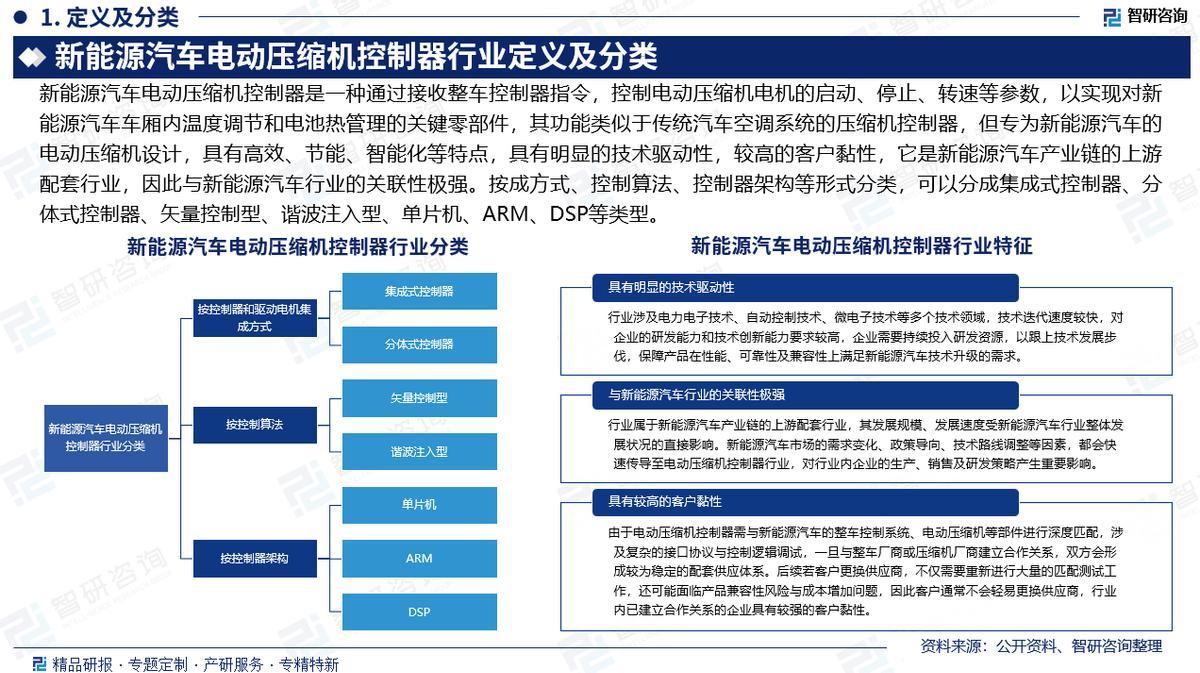 行业定义及功能:新能源汽车电动压缩机控制器是一种通过接收整车控制器指令,控制电动压缩机电机的启动、停止、转速等参数,以实现对新能源汽车车厢内温度调节和电池热管理的关键零部件,其功能类似于传统汽车空调系统的压缩机控制器,但专为新能源汽车的电动压缩机设计,具有高效、节能、智能化等特点。