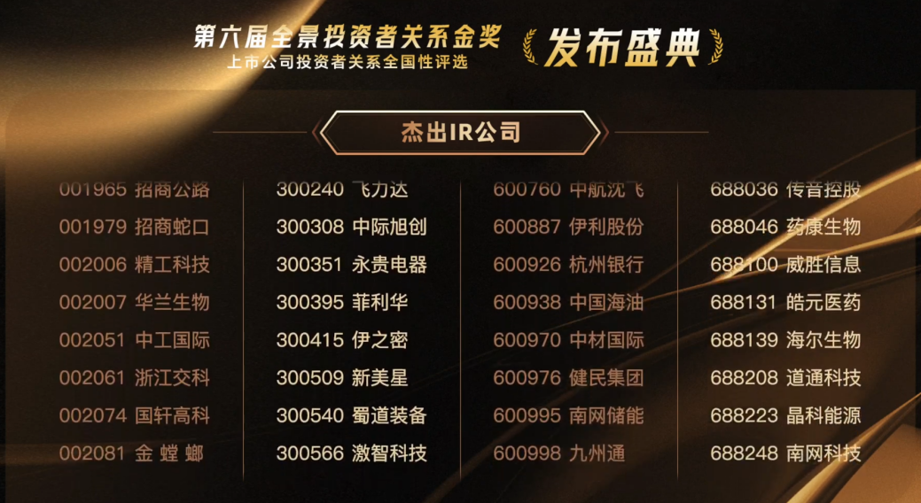 作为国内资本市场IR领域极具影响力的评选,“全景投资者关系金奖”秉承“创新、专业、公正”的理念,聚焦上市公司投资者关系管理工作,以其权威的评审标准、严谨的评选流程和广泛的行业影响力,成为资本市场衡量上市公司投资者关系工作成效的重要标杆。