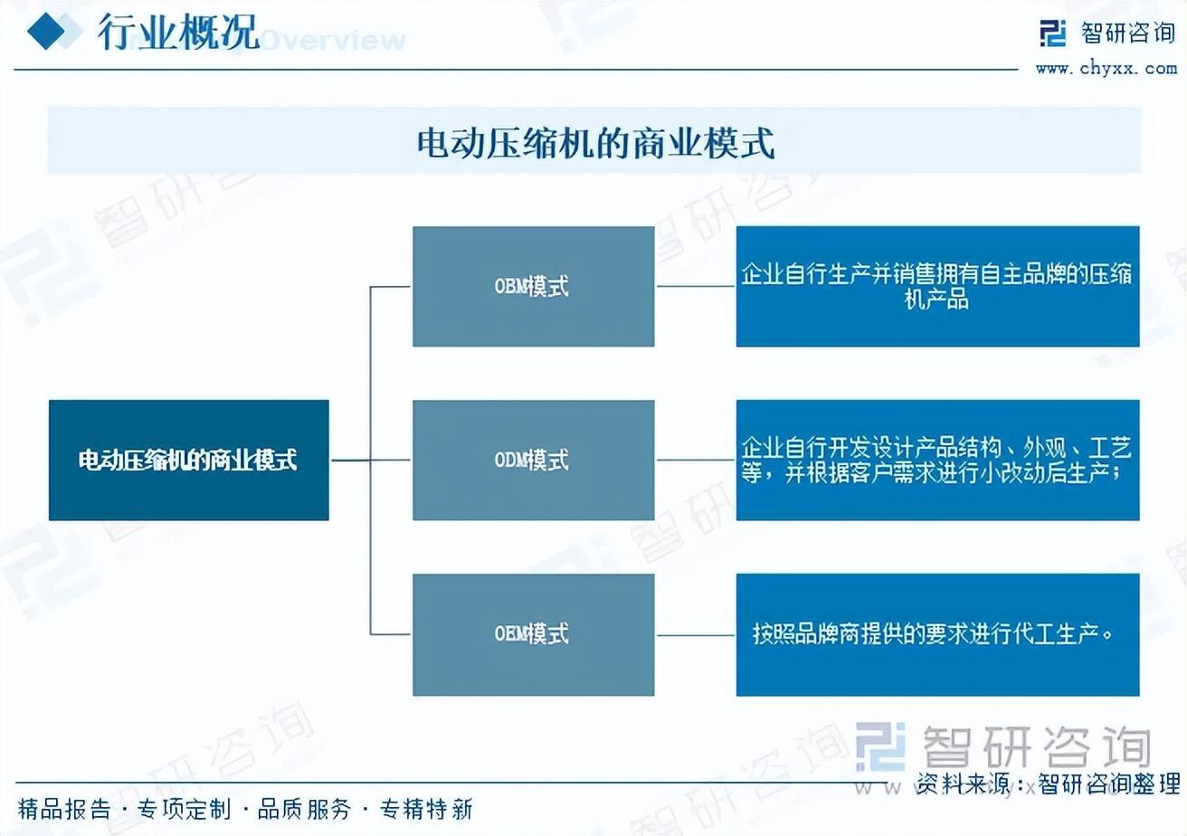 电动压缩机的商业模式主要有OBM(原始品牌制造商)、ODM(原始设计制造商)与OEM(原始设备制造商)三种模式。