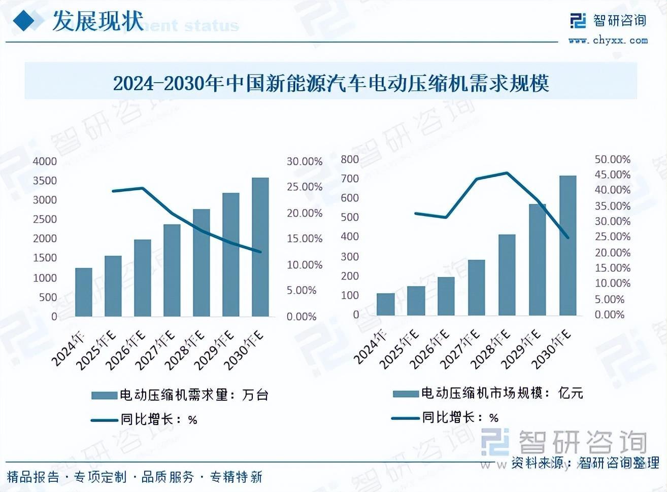 内容概要:电动压缩机是新能源汽车热管理的核心部件,堪称“心脏”,其作用至关重要。它不仅为系统提供主动制冷(热)的动力,还确保了电动汽车的稳定运行和驾驶舒适度。近年来,随着新能源汽车市场的迅猛发展,电动压缩机的市场需求不断攀升。据统计,2024年,我国新能源汽车电动压缩机需求量约1286.6万台,市场规模约114.5亿元;预计2025年,我国新能源汽车电动压缩机需求量将达1600万台,市场规模将达152亿元。在国家政策的支持下,预计未来几年,新能源汽车将持续保持强劲的发展势头,进而带动汽车电动压缩机市场的持续扩张。