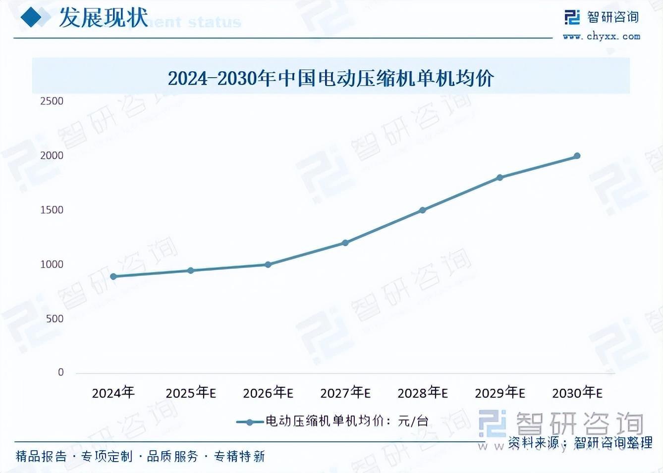 电动压缩机的研发与生产涉及精密机械加工、电机控制、冷媒系统匹配等多个技术领域。近年来,这些领域的技术不断革新,技术复杂度显著提升,持续推动产品性能升级,导致生产成本增加。2024年我国电动压缩机单机均价890元/台,预计2025年约为950元/台,至2030年我国电动压缩机单机均价将达2000元/台。