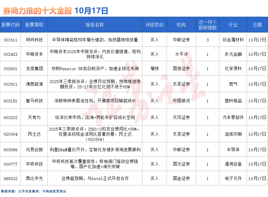 珂玛科技最受券商关注,近一个月获国元证券、华源证券等3份券商研报关注,位居10月17日券商力推股榜首。