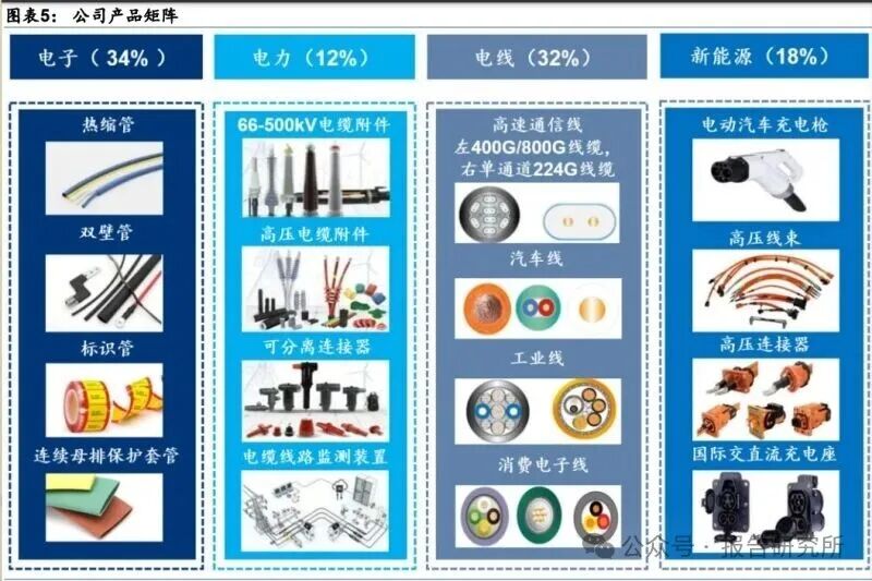 经过近三十年的发展,公司以热缩材料为创业基石,推动新材料向其他领域延伸,目前已 形成“三电一新”电子业务、电线业务、电力业务和新能源业务四大板块: 1)电子业务:主要包括热缩管、双壁管、标识管、母排管等。公司电子材料具有收缩方便、 耐温、阻燃、防腐、无卤环保等优良特点,为电线、电缆、电气设备提供绝缘防护功能, 广泛应用于电子、电器、通讯、汽车、轨道交通、医疗及核电等众多领域。 2)电线业务:主要包括高速通信线、汽车线、工业线等重点产品,服务于高速通信设备、 工业装备及机器人、汽车等核心市场。其中,高速铜缆主要用于算力中心、云计算平台及 服务器交换互连等关键 IT 基础设施,覆盖安费诺、豪利士、莫仕、泰科等国际客户,以及 立讯、英飞联等国内多家连接器企业。 3)电力业务:分为传统电力和风力发电,传统电力业务主要涵盖各应用领域及各电压等级 的电缆附件、可分离连接器等,具备为电缆与输配电线路提供保护、连接和固定等功能。 公司电力产品具有施工科学方便、绝缘强度高、性能可靠等优点,广泛应用于发电、配电、 成套设备、轨道交通、冶金矿山、石油化工、高铁、船舶、航天航空等领域。风力发电业 务方面,2024 年年度上网电量为 2.96 亿千瓦时,全部销售给国网山东省电力公司烟台供电 公司。 4)新能源业务:新能源汽车业务相关产品主要有电动汽车充电枪、充电座、车内高压线束 及高压连接器等,客户包括比亚迪、广汽、长安汽车等大型国有企业或知名公司。风力发 电从技术维度划分亦可属新能源业务。