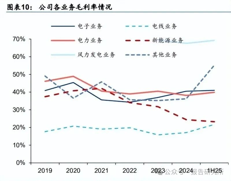 公司毛利率常年稳定,电线业务毛利率有望在高速通信线放量后持续提升。整体上看, 2020-1H25 年公司综合毛利率分别为 39.32%/32.49%/31.53%/32.63%/31.73%/32.45%, 2021 年有明显下滑,一方面是由于原材料采购成本大幅上涨,公司产品销售价格未进行全 面的调整,另一方面在于受到会计准则变更的影响,部分销售费用被重分类至营业成本, 导致毛利率下滑。2021-1H25,公司毛利率维持在 32%上下,成本管控卓有成效。 分业务来看,电子业务、电线业务、电力业务、新能源业务、风力发电业务毛利贡献(即 各业务毛利占总毛利比重)分别为 42.7%/21.2%/15.2%/12.9%/4.3%,电子业务作为公司 传统优势领域,稳定为公司贡献近半数毛利,电子业务 2020-1H25 年毛利率分别为 45.4%/35.6%/34.3%/37.0%/40.5%/41.0%,2022 年以来实现逐年增长,系原材料价格下降 及 公 司 降 本 举 措 双 重 作 用 。 电 线 业 务 2020-1H25 年 毛 利 率 分 别 为 20.7%/19.1%/19.9%/15.8%/17.1%/21.7%,我们认为,电线业务中毛利率更高的高速通信 线产品仍处于产能扩张期,未来有望拉升该板块毛利率。电力业务 2020-1H25 年毛利率分 别为 48.9%/40.6%/39.0%/40.5%/38.1%/39.9%,2021-1H25 年稳定在 38%-41%区间。新 能源业务 2020-1H25 年毛利率分别为 40.8%/42.1%/34.1%/31.8%/24.5%/23.3%,呈现逐 年下降趋势,主因下游议价能力较强导致价格存在年降情况。2023/2024/1H25 年风力发电 业务毛利率分别为 69.5%/67.6%/69.2%。