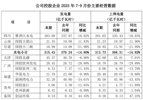 2025 年7-9月,公司控股企业平均上网电价0.334元/千瓦时,与去年同期相比减少0.9%。2025年1-9月,公司控股企业平均上网电价0.346元/千瓦时,与去年同期相比减少3.9%。