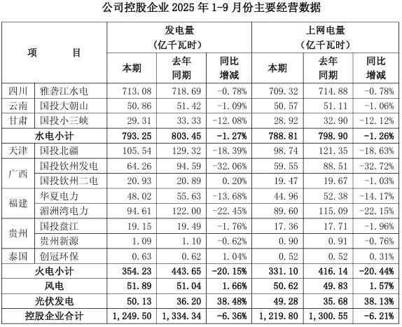 北极星电力网获悉,国投电力公告披露三季度主要经营数据,2025年7-9月,公司控股企业累计完成发电量478.91亿千瓦时,上网电量468.08亿千瓦时,与去年同期相比分别减少14.42%和14.42%。2025年1-9月,公司控股企业累计完成发电量1249.50亿千瓦时,上网电量1219.80亿千瓦时,与去年同期相比分别减少6.36%和6.21%。