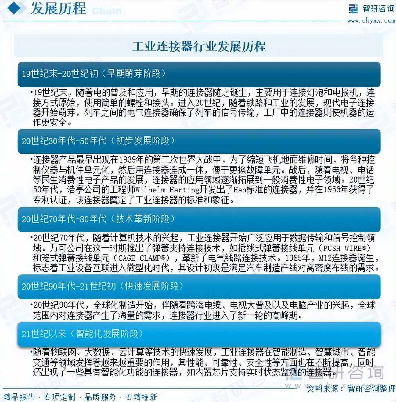 注:本文节选出自智研咨询发布的《研判2025!中国工业连接器行业发展历程、产业链、市场规模、竞争格局及发展前景展望:受工业自动化领域需求推动,工业连接器市场规模达295.94亿元[图]》行业分析文章,如需获取行业文章全部内容,可进入智研咨询搜索查看。