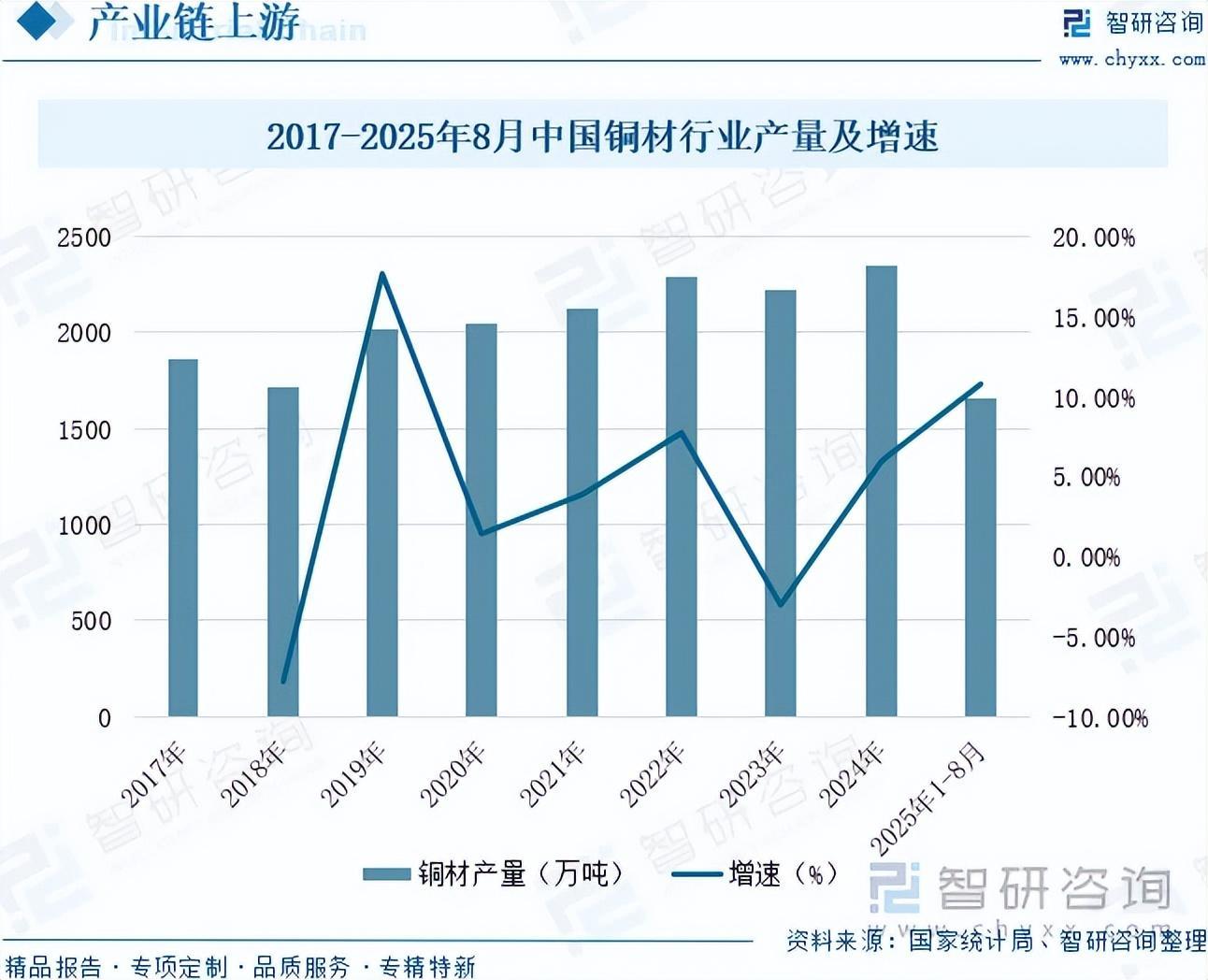 铜材凭借其优异的导电性、导热性及良好的力学性能,成为制造工业连接器导电端子等核心部件的关键材料。近年来,在电力电网、家电设备等传统领域需求保持稳定的支撑下,铜材行业奠定了坚实的产量基础。与此同时,新能源汽车、光伏储能、特高压建设及5G通信等新兴领域的蓬勃发展,对高性能、特种铜材形成了显著拉动,成为推动产量增长的重要动力。在国家“双碳”战略引导与全球能源结构转型的背景下,铜材作为能源传输与电子信息产业不可或缺的基础材料,其市场需求空间持续拓宽。国家统计局数据显示,中国铜材行业产量从2017年的1861.7万吨增长至2024年的2350.3万吨,年复合增长率为3.39%。2025年1-8月,中国铜材行业产量为1659.8万吨,同比增长10.7%。未来,随着铜材产量的持续增长和材料性能的不断优化,将为工业连接器等下游行业提供更充足的原料保障和更广阔的技术升级空间。
